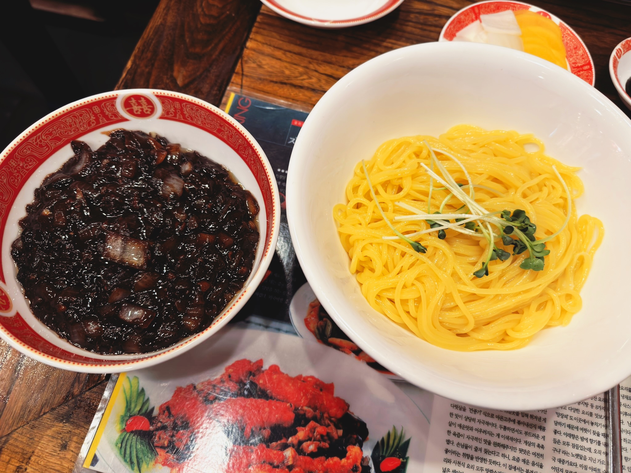 이번엔 굴짬뽕(빨간 짬뽕)과 유니간짜장 곱배기를 주문했습니다. 유니간짜장 곱배기는 12,000원