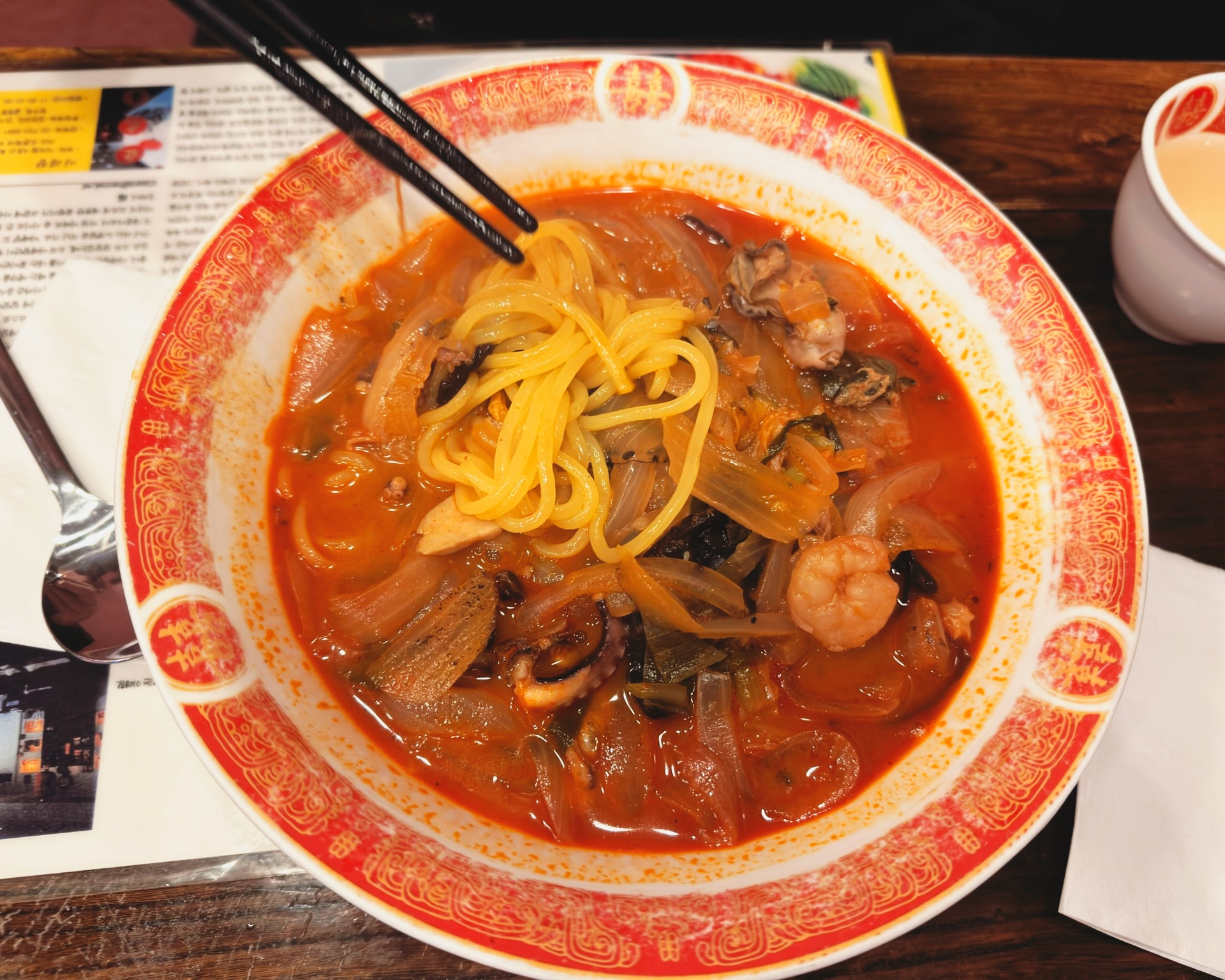 굴짬뽕은 빨간 짬뽕입니다. 칼칼하고 매콤하니 맛있습니다.