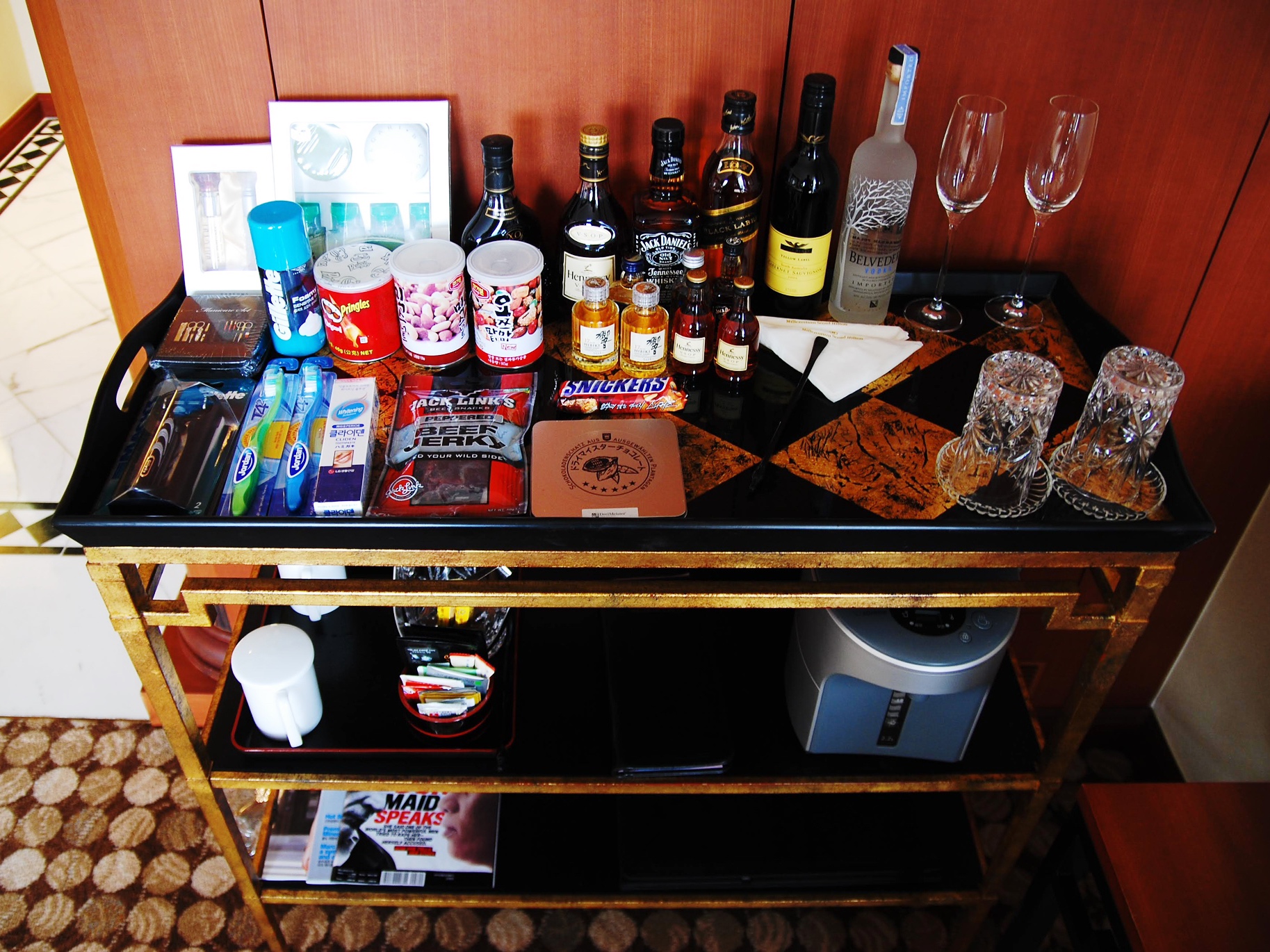 미니바에 여러 먹거리들이 있습니다.