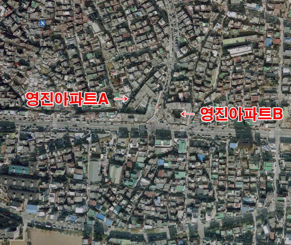 붉은 동그란 원이 총 6개 동의 홍제 시민아파트 단지인데 그 중 화살표의 아파트가 촬영했던 아파트로 보입니다.