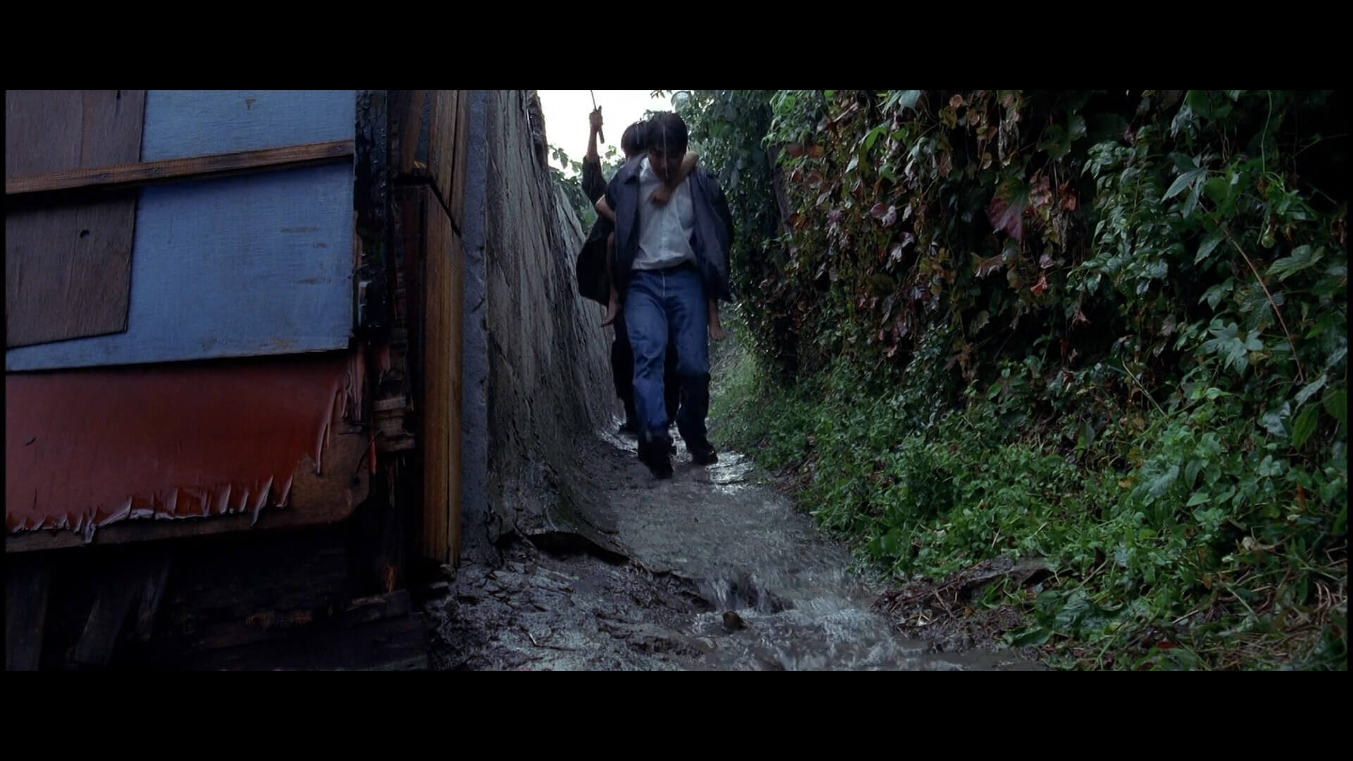 많은 비가 내리는 난곡의 좁은 길을 아이 업고 내려오는 씬