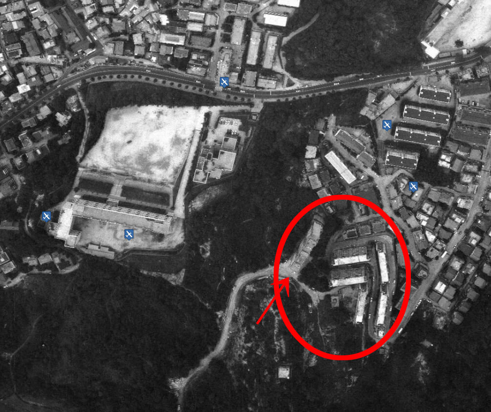 붉은 동그란 원이 총 6개 동의 홍제 시민아파트 단지인데 그 중 화살표의 아파트가 촬영했던 아파트로 보입니다.