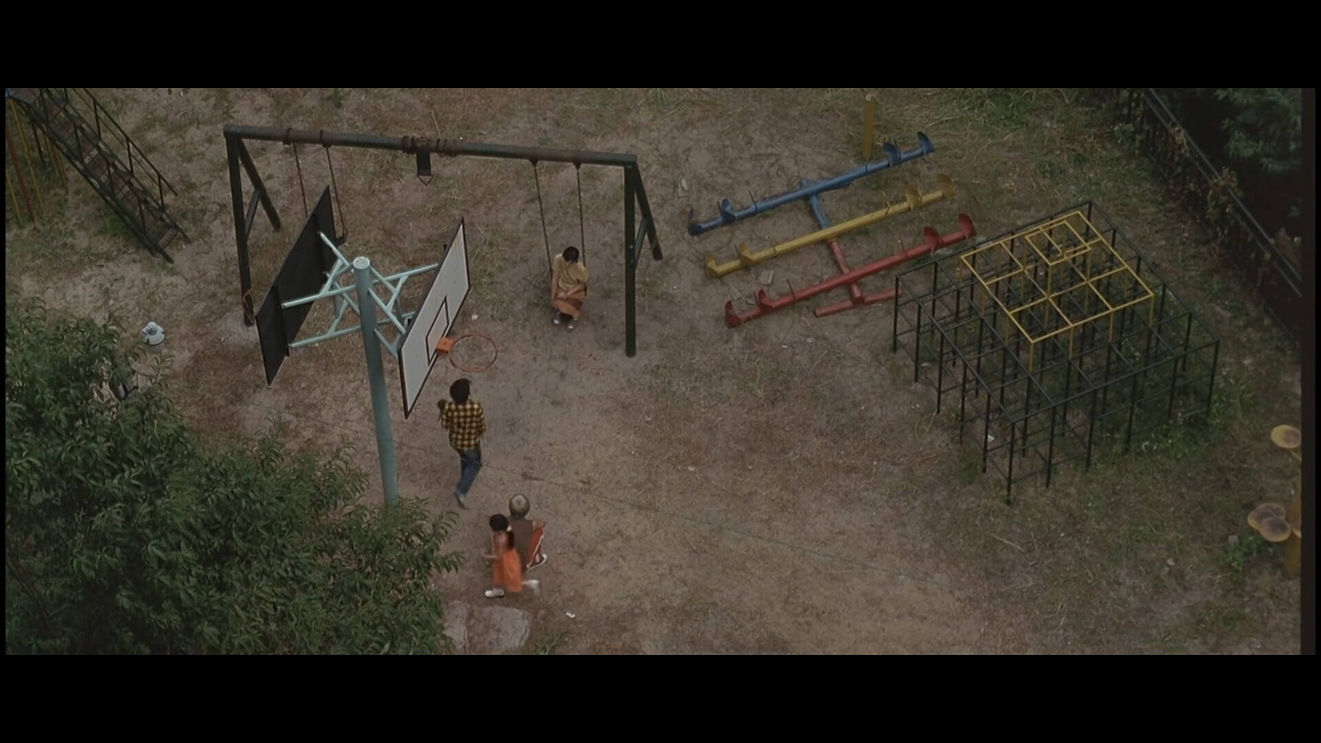 마치 요즘 드론으로 바라 본 모습이 나오는데 놀이터에 농구대도 있습니다. 추억의 철제 놀이기구들이 참 많네요.