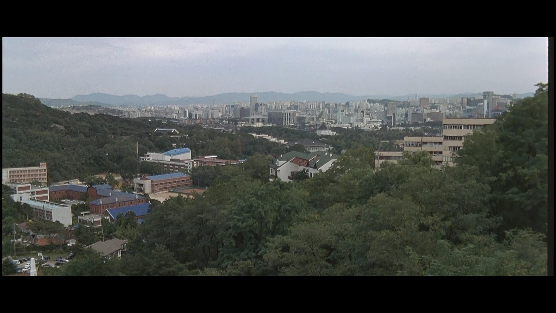 카메라는 점점 고개를 들며 서울 시내를 바라봅니다. 왼쪽으로 파란 지붕의 경기상고가 보이며 오른쪽으로 노란색의 청운 시민아파트 일부동도 보입니다.