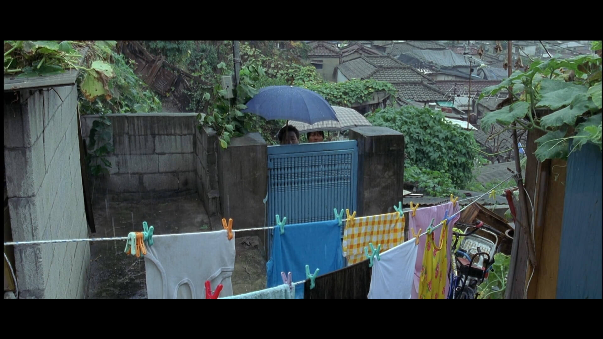 어느 높은 곳의 집의 빨랫줄에 빨래집게에 집힌 옷들이 보입니다. 그 뒤로 집들이 빼곡합니다.