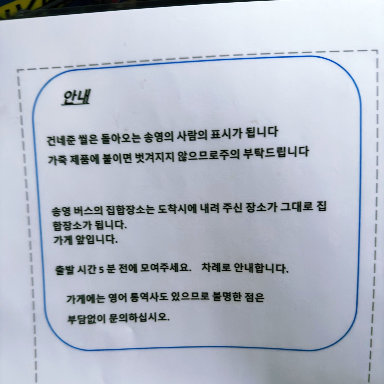 셔틀버스에 있던 안내문. 셔틀버스에 타면 스티커를 주는데 옷에 붙이고 다니면 됩니다.