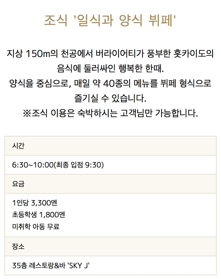 JR 타워 호텔 닛코 삿포로의 조식은 일본식과 뷔페 중 선택 가능합니다. 저는 조식 포함으로 예약하지 않아서 조식 비용을 룸차지로 돌렸습니다. 자세한 내용은 아래에