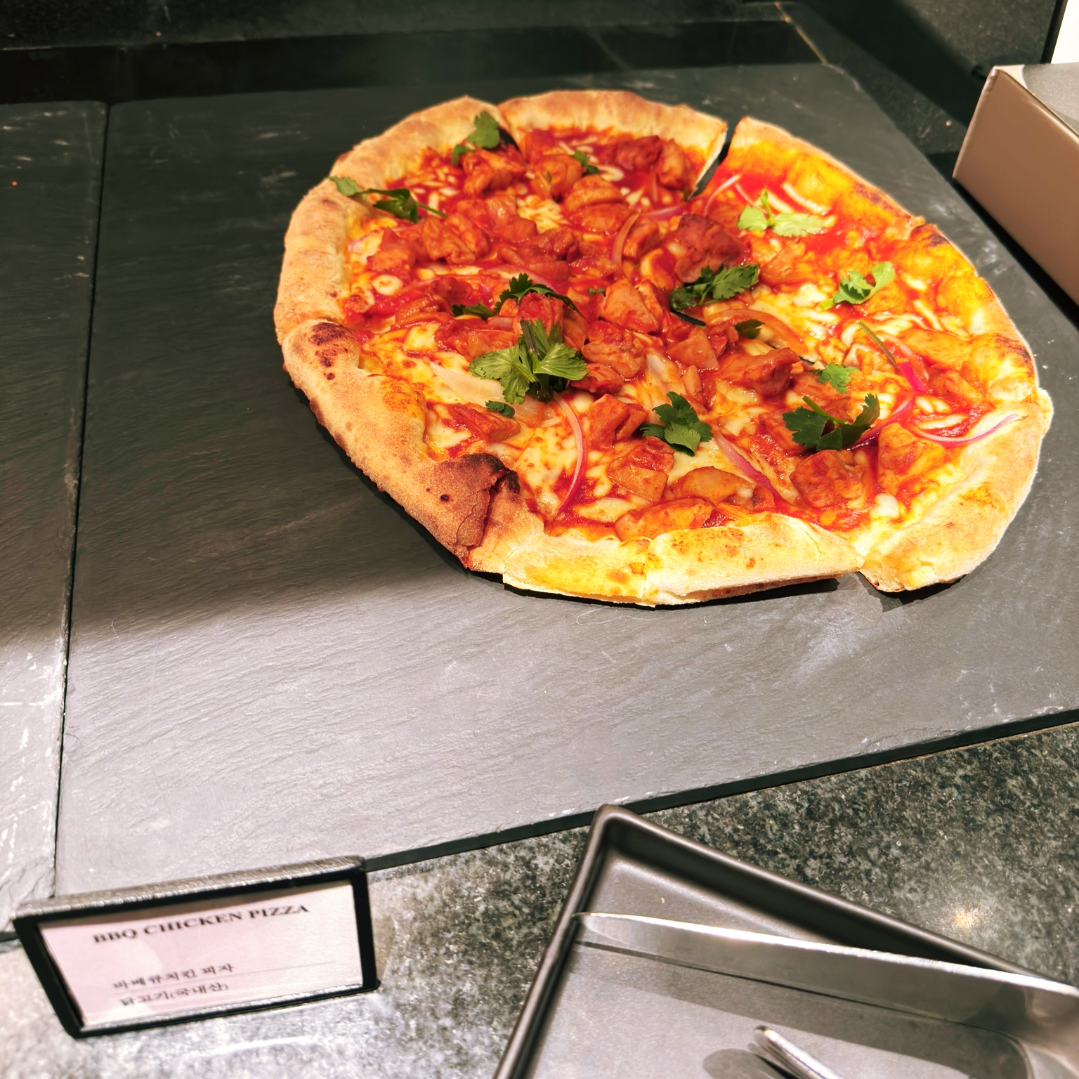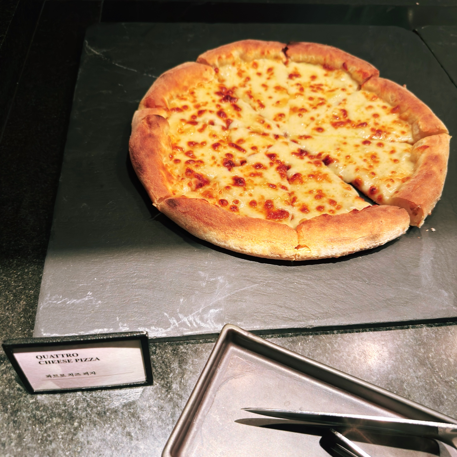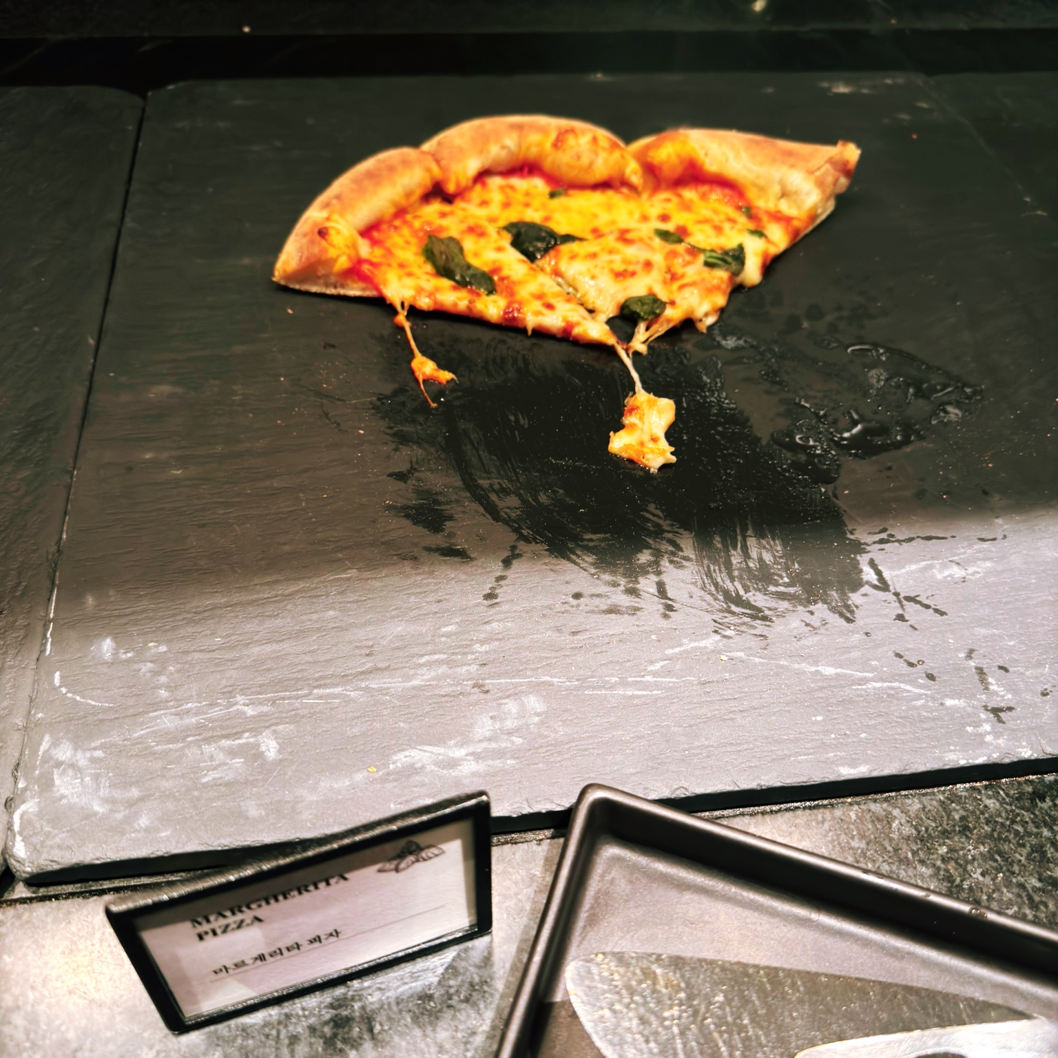 피자가 저번보다 나아졌습니다. 치즈가 저번엔 거의 없거나 메말랐는데 치즈 양이 들어서 플레이트가 기름칠이 되어있네요. 역시 피자는 치즈가 많아야지!